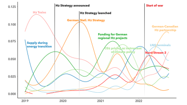 ![]()  ![]()  Auswirkungen des russischen Krieges gegen die Ukraine auf den deutschen Wasserstoffdiskurs 18.01.2024 Neue Publikation im Journal Sustainability Eine neue Publikation von Clean Circles-Forscher*innen zusammen mit Kolleg*innen der TU Darmstadt und des KIT befasst sich mit den transformativen Auswirkungen des russisch-ukrainischen Krieges auf den deutschen Wasserstoffdiskurs.