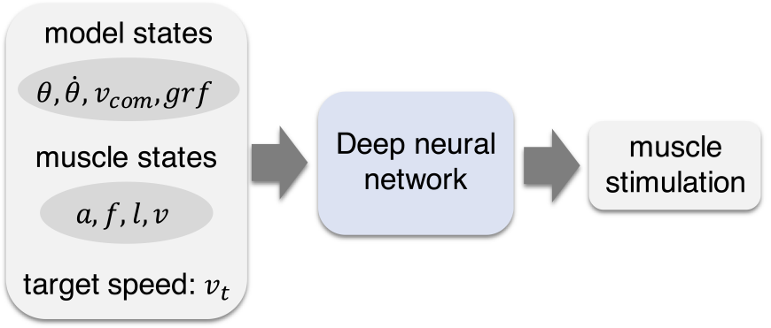 A lower limb gait model consists of seven segments, fourteen degrees of freedom, and twenty-two Hill-type muscles was built to capture human leg dynamics and the characteristics of muscle properties. We implemented the proximal policy optimization algorithm to learn the sensory-motor mappings (control policy) and generate human-like walking behavior for the model. Human motion capture data, muscle activation patterns and metabolic cost estimation were included in the reward function for training.
