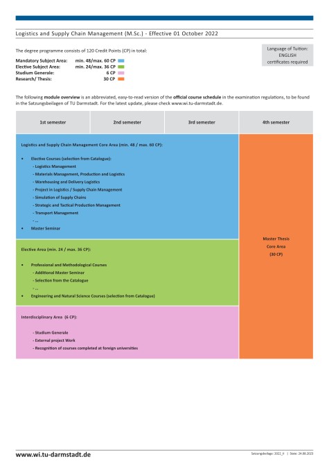 Immatrikulationsvoraussetzungen sind: 1. Abschluss des B.Sc. Wirtschaftsingenieurwesen mit der technischen Fachrichtung Bauingenieurwesen, Elektrotechnik und Informationstechnik, Maschinenbau oder Materialwissenschaft beziehungsweise B.Sc. Wirtschaftsinformatik der TU Darmstadt (Referenzstudiengänge) oder ein gleichwertiger Abschluss, z.B. in Wirtschaftswissenschaften oder Wirtschaftsmathematik. 2. Englischkenntnisse auf dem Niveau C1, nachzuweisen über Schulzeugnisse oder Äquivalente. 3. Weitere Zulassungsvoraussetzungen: Ordnung des Studiengangs Kompetenzbeschreibungen Informationen des Fachbereichs |