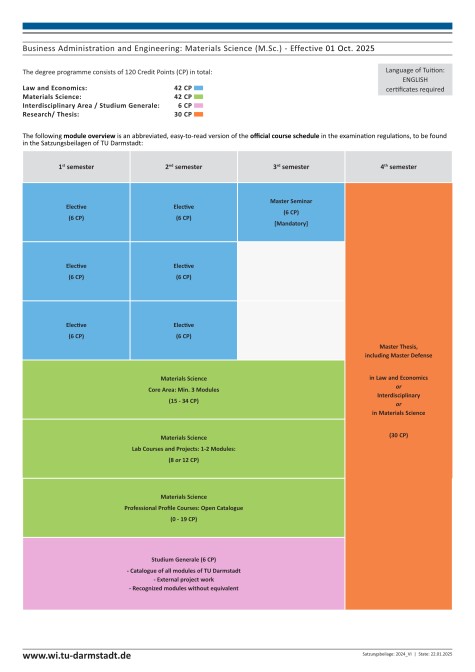 Immatrikulationsvoraussetzungen sind: 1. Abschluss des B.Sc. Wirtschaftsingenieurwesen — technische Fachrichtung Materialwissenschaft der TU Darmstadt (Referenzstudiengang) oder ein gleichwertiger Abschluss. 2. Weitere Zugangsvoraussetzungen siehe: Ordnung des Studiengangs Kompetenzbeschreibungen mit Zugangskriterien. |