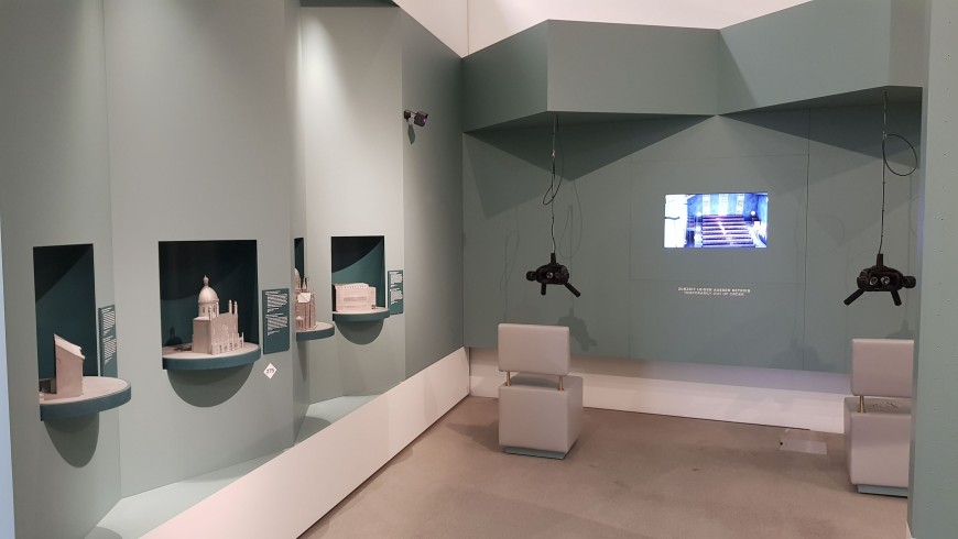 Direkt neben der Station mit den virtuellen Synagogen befindet sich eine Installation mit vier haptischen Synagogen-Modellen aus Edelstahl. Zusätzlich zu den rekonstruierten Synagogen Köln Glockengasse, Plauen und Hannover, wird noch die Synagoge München, Westenrieder Straße, präsentiert. Das Besondere ist, dass die Synagogen aus dem digitalen Datensatz in Edelstahl 3D gedruckt wurden – eine innovative Technologie, die in der Qualität erst seit wenigen Jahre zu Verfügung steht.