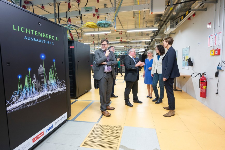 Auch von der wissenschaftlichen Infrastruktur des Hochleistungsrechners zeigten sich die Ministerinnen beeindruckt. Ausgestattet mit neuester Technologie erfüllt der Rechner höchste Kriterien bei Leistung und Energieeffizienz. Lichtenberg II ist Teil des Verbunds für Nationales Hochleistungsrechnen (NHR) und unterstützt die überregionale Bereitstellung von Rechenleistung für die Wissenschaft besonders nachhaltig und ressourceneffizient.