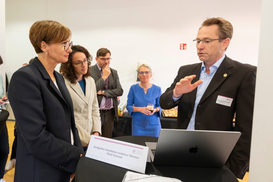 Im Gespräch mit den Ministerinnen stellten Forschende der TU Darmstadt ihre aktuellen Projekte vor: Vera Krewald, Professorin für Theoretische Chemie und Vize-Sprecherin des DFG-Sonderforschungsbereichs „Eisen, neu gedacht“, skizzierte die Forschung zur „Katalyse mit Eisen für eine grünere Zukunft“. Professor Christian Hasse, Leiter des Fachgebiets Simulation reaktiver Thermo-Fluid-Systeme und Co-Sprecher des Clusters „Clean Circles – Eisen als Energieträger einer klimaneutralen Kreislaufwirtschaft“, entwarf realistische kontinentale Szenarien für das hochenergetische und breit verfügbare Material Eisen als Speicher- und Transportmedium. Professorin Bai-Xiang Xu, Leiterin des Fachgebiets Mechanik funktionaler Materialien, gab Einblicke in die Forschung zu intelligenten Materialien, die von hoher Bedeutung für eine nachhaltige Energiewende sind, um etwa wertvolle Metalle und seltene Erden substituieren zu können.